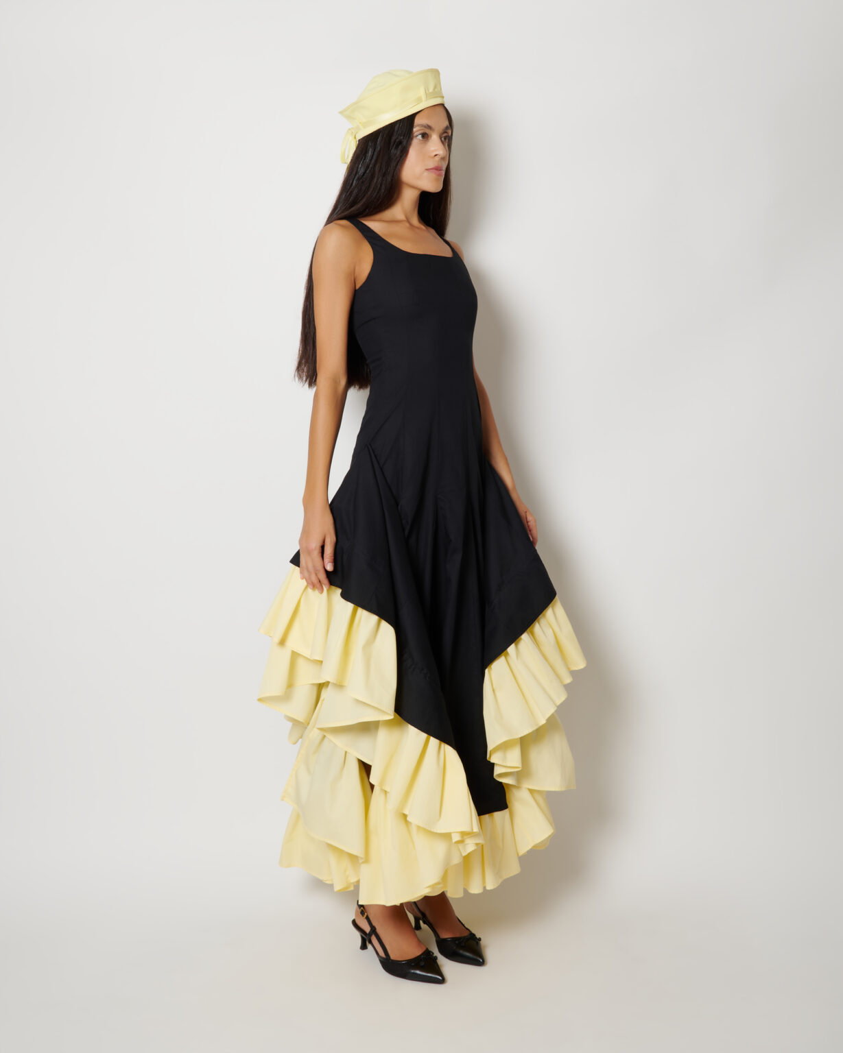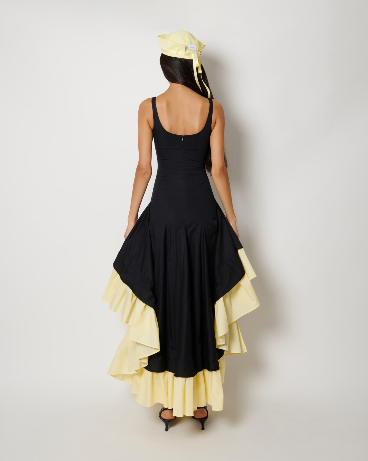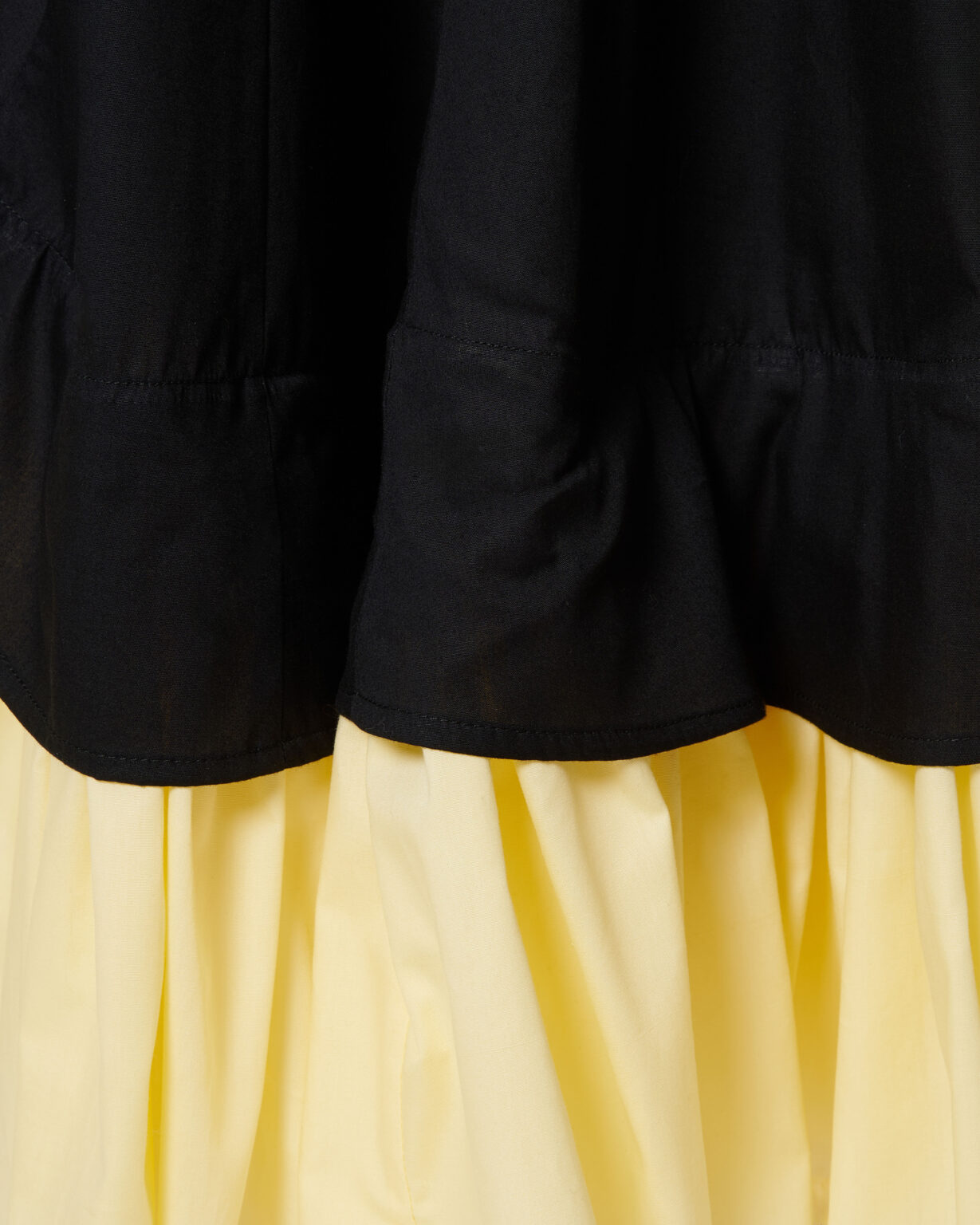 La costruzione è enfatizzata da una sovrapposizione asimmetrica che lascia intravedere balze a contrasto in giallo burro, creando volume e movimento. Il gioco di lunghezze aggiunge profondità mantenendo un’estetica pulita.