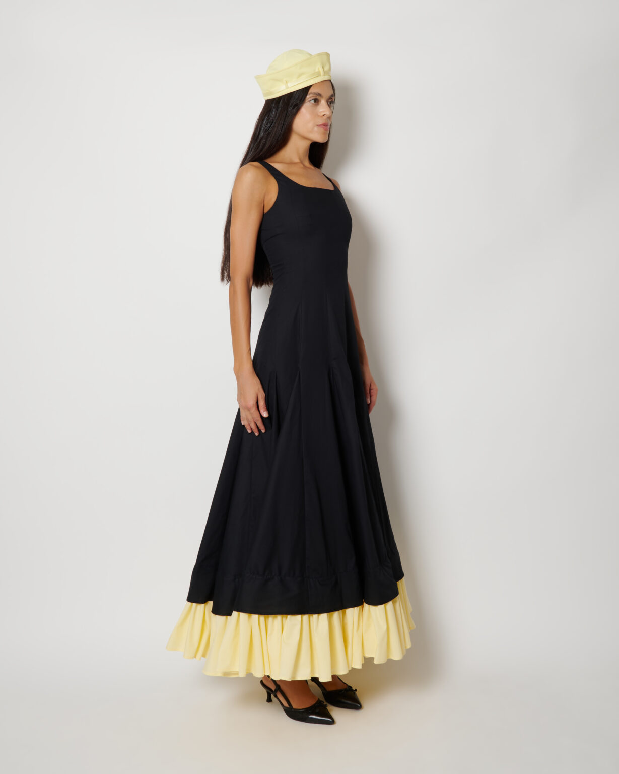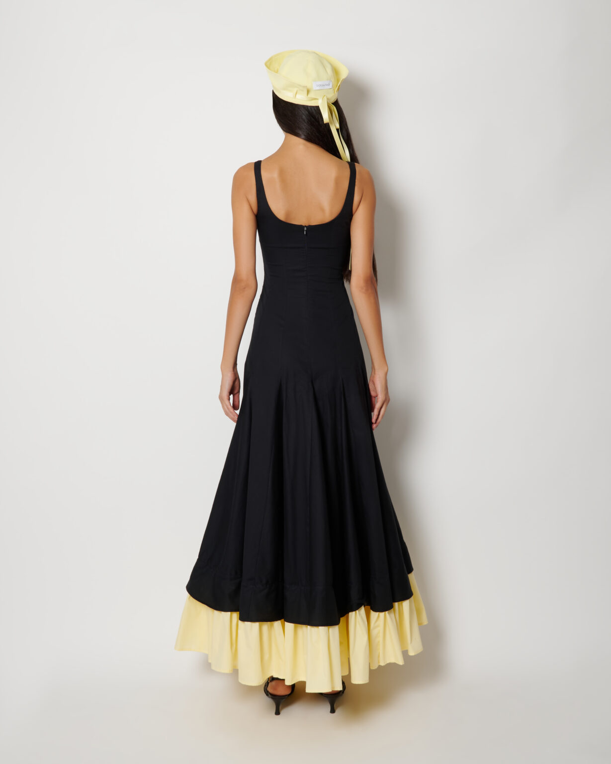 La silhouette si apre progressivamente sul fondo, dove una balza a contrasto in tono giallo burro introduce movimento e volume. Il gioco di colori enfatizza la costruzione del capo mantenendo un’estetica pulita.