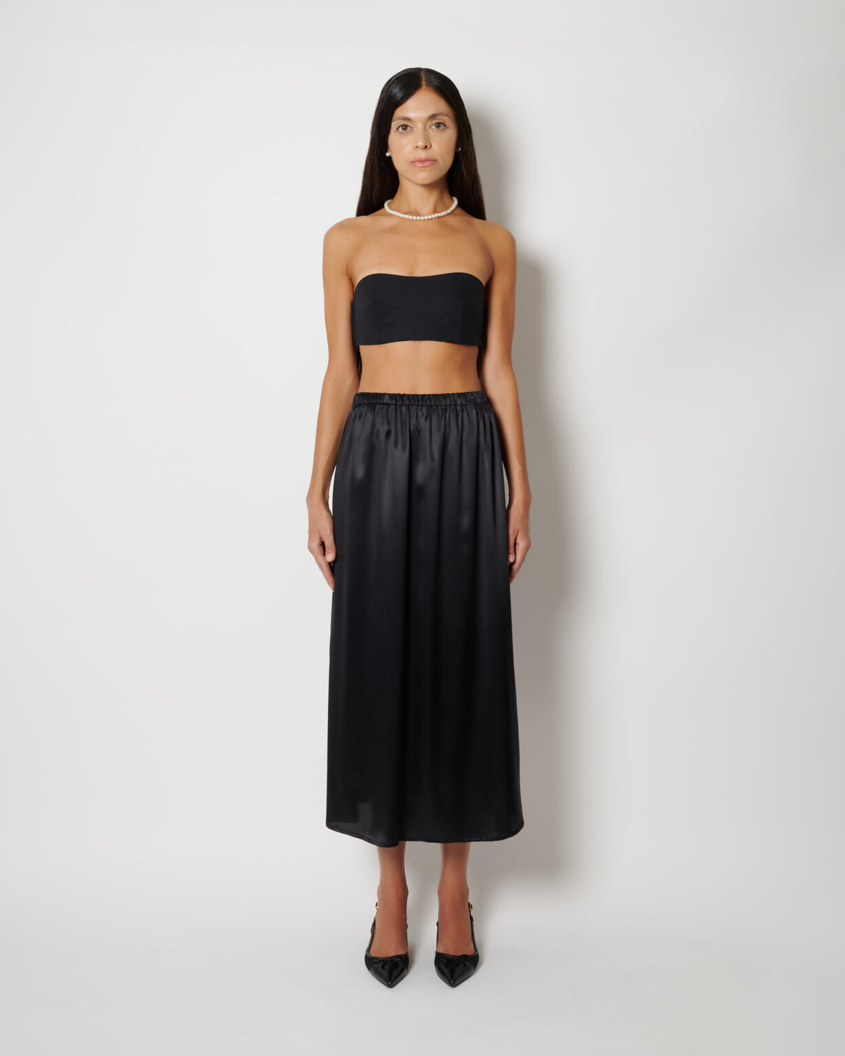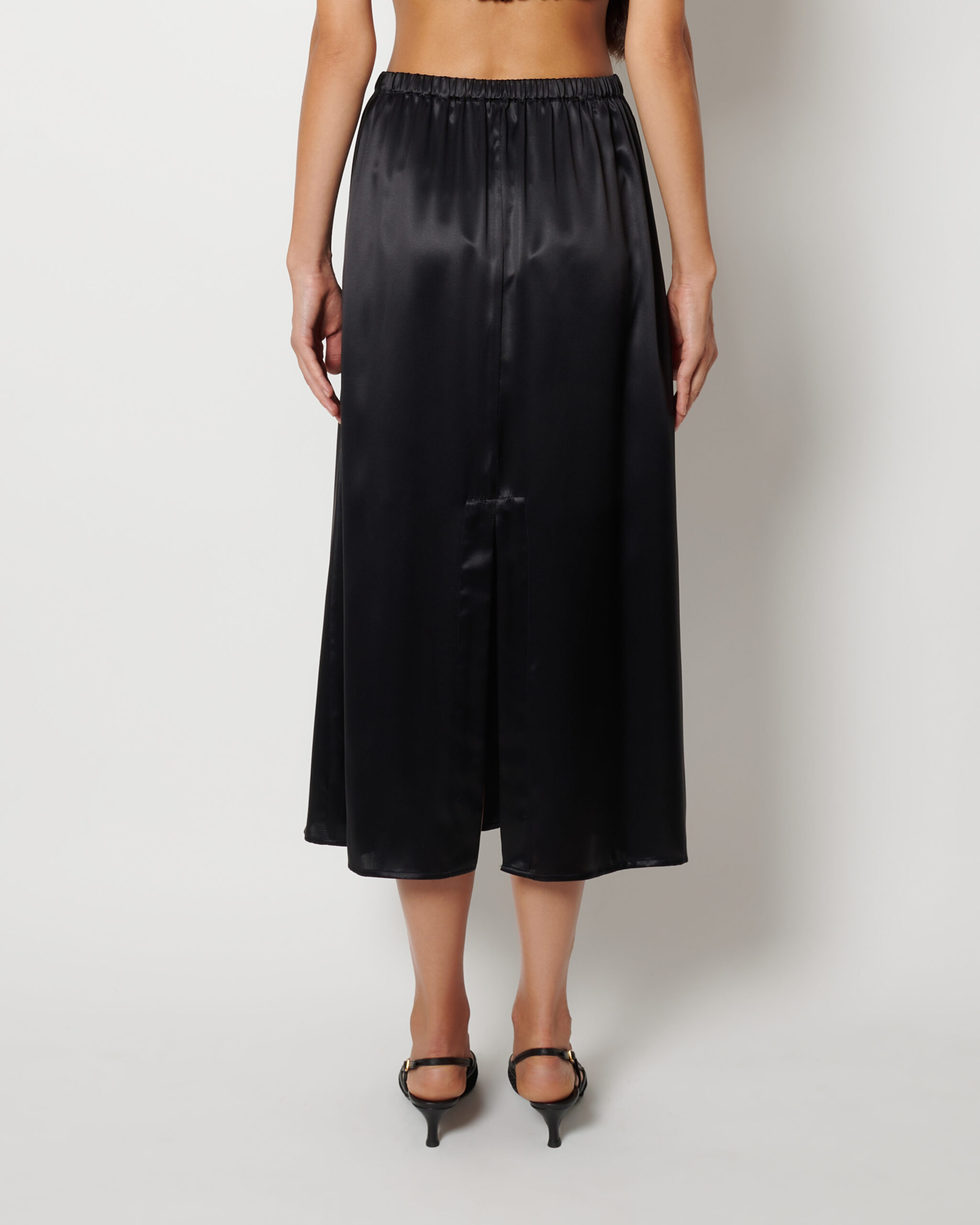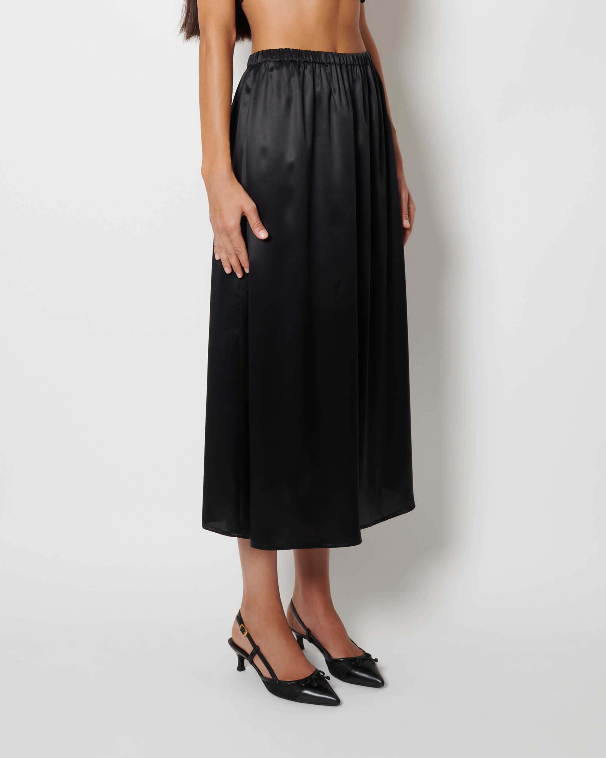 Realizzata in raso di seta, questa gonna presenta una linea fluida e una vestibilità confortevole. Il modello è caratterizzato da una vita elasticizzata e da una silhouette midi che scivola sul corpo con naturalezza.
