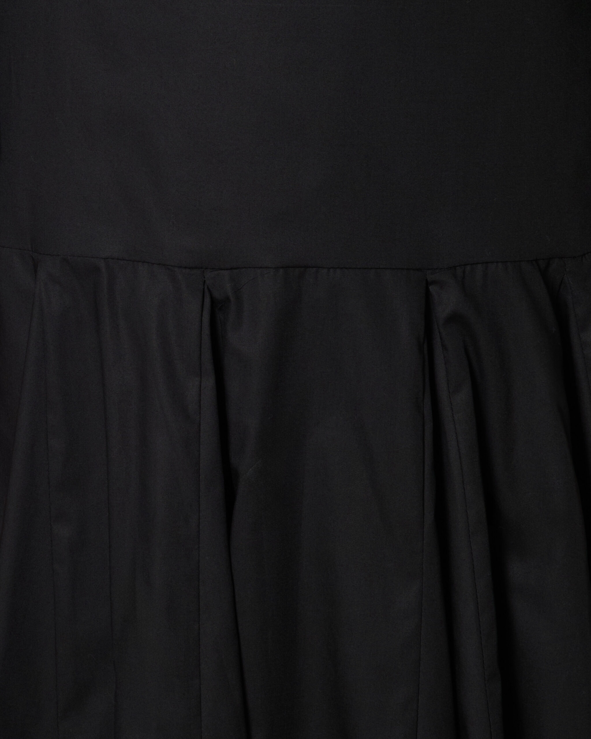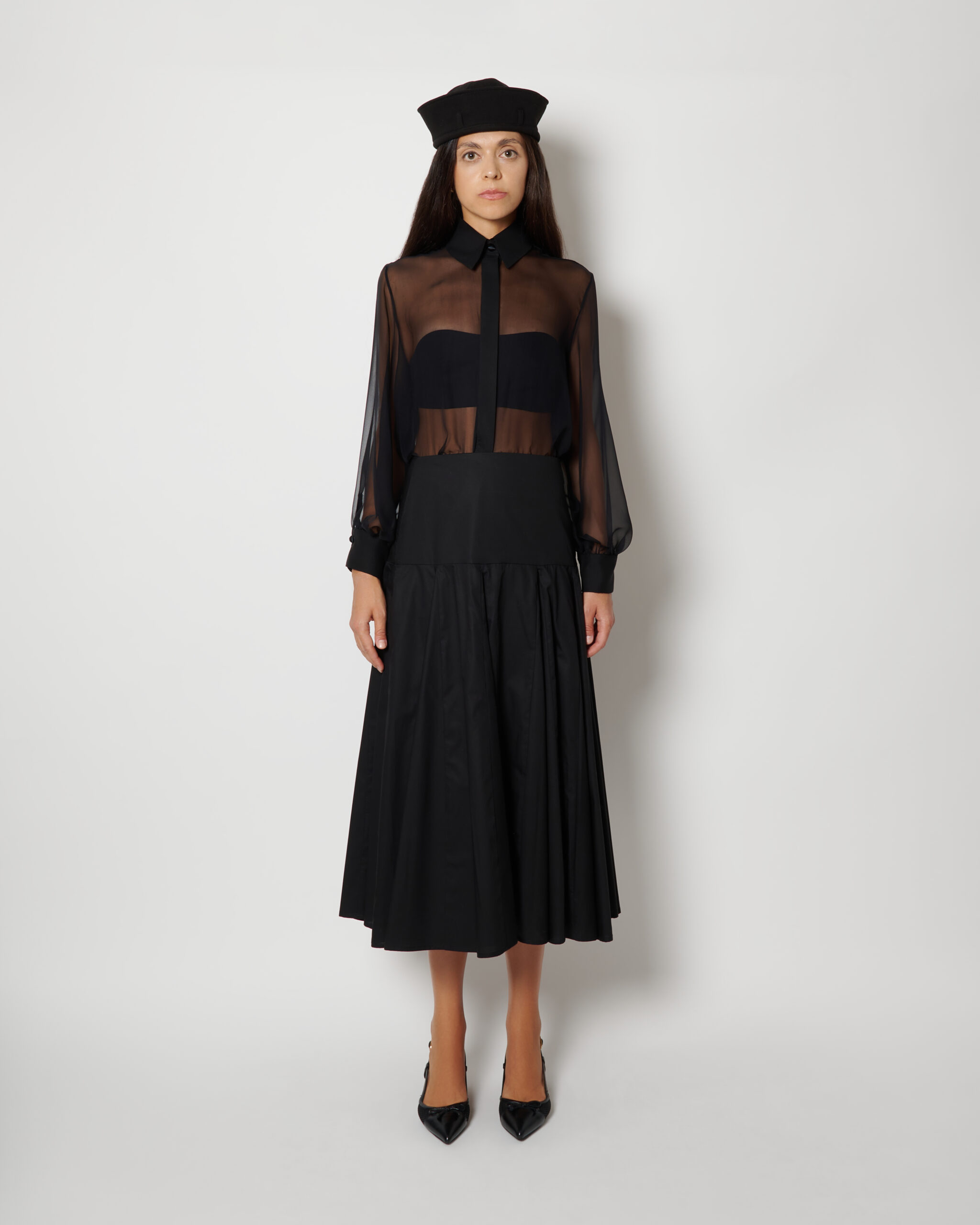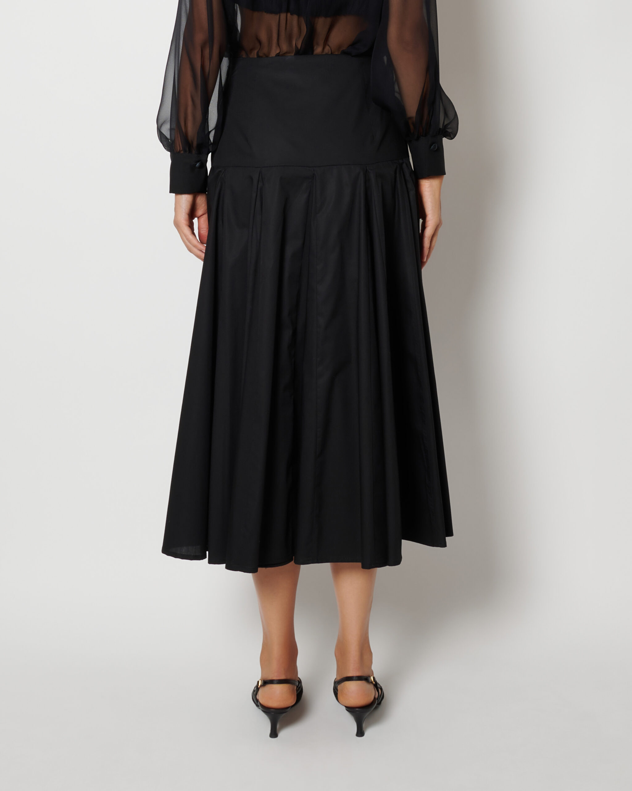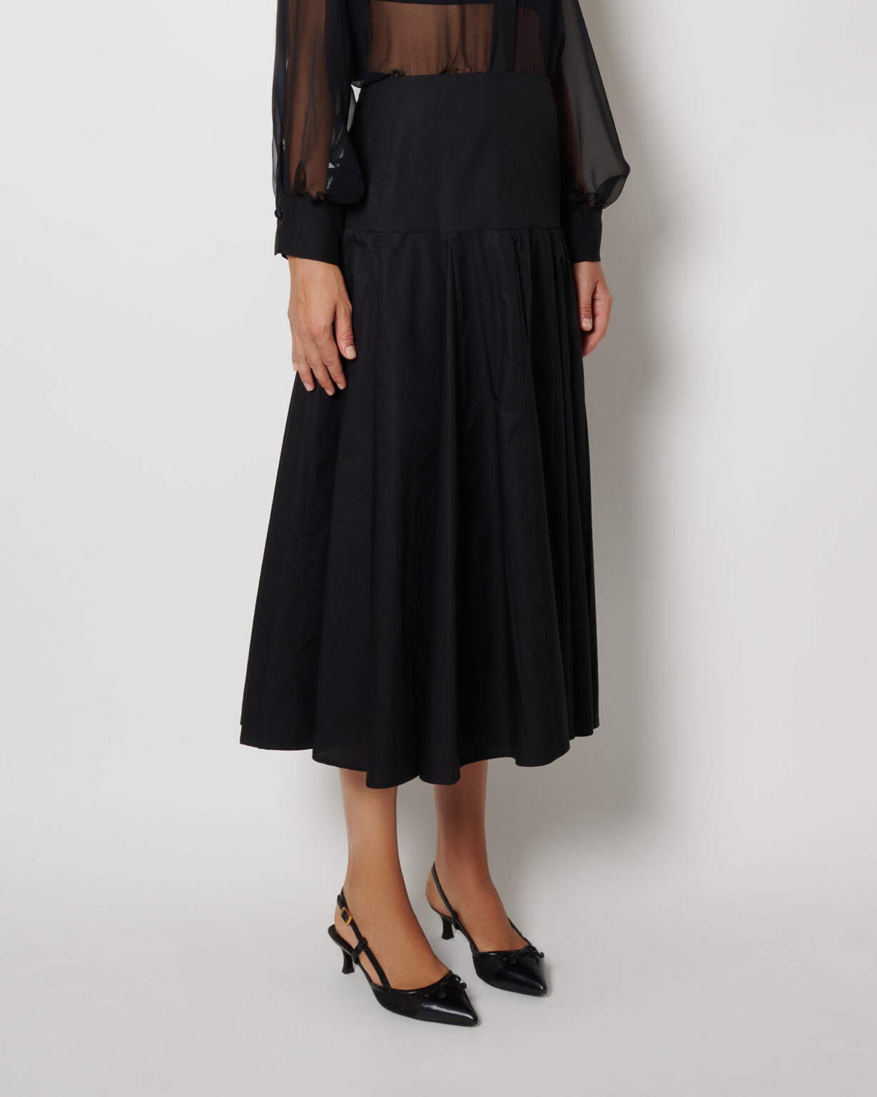 Questa gonna in cotone è progettata con una vita alta strutturata che definisce la silhouette, aprendosi in una linea midi fluida. Il modello presenta una costruzione a pannelli che accompagna il movimento in modo naturale, creando volume controllato e una linea pulita.