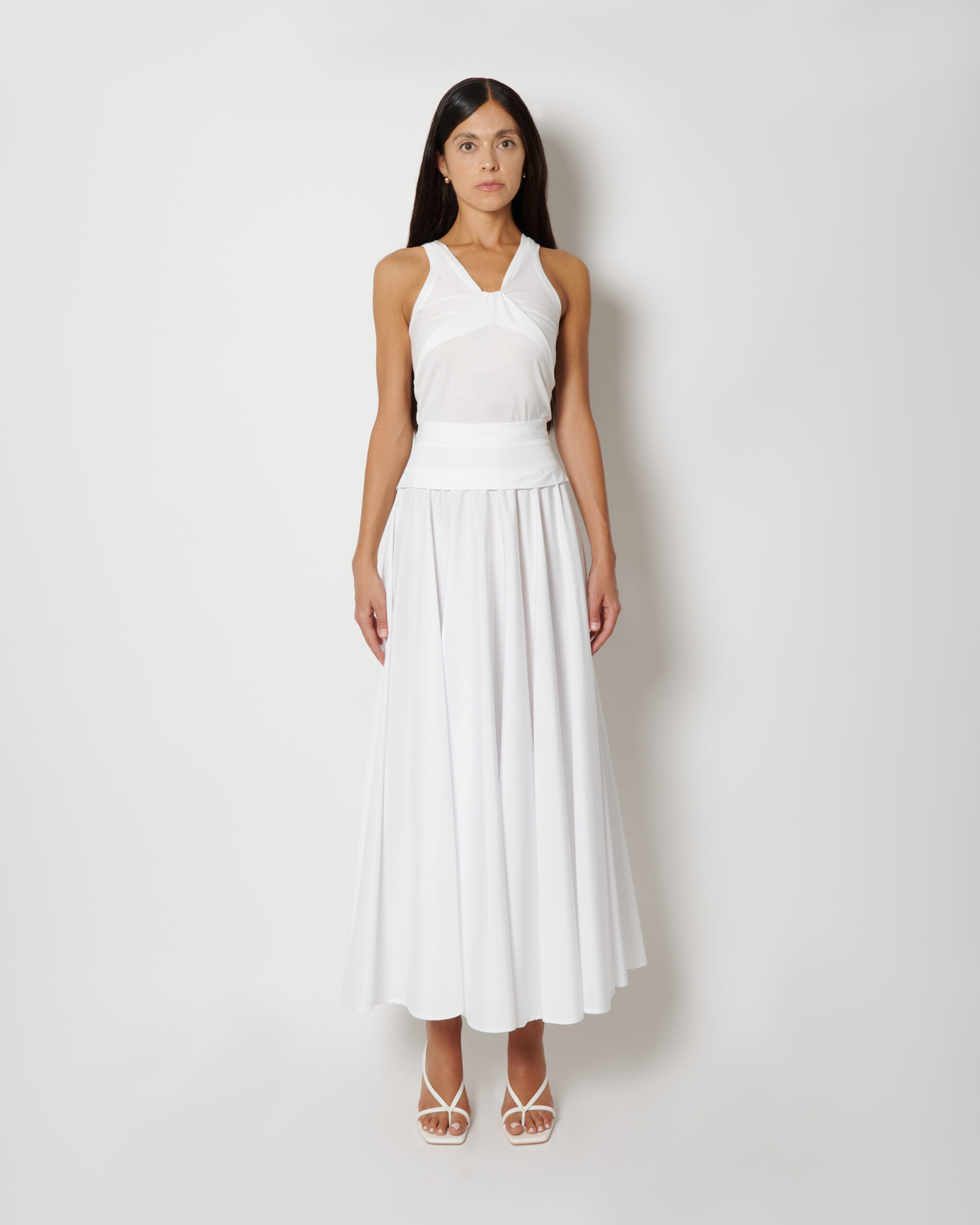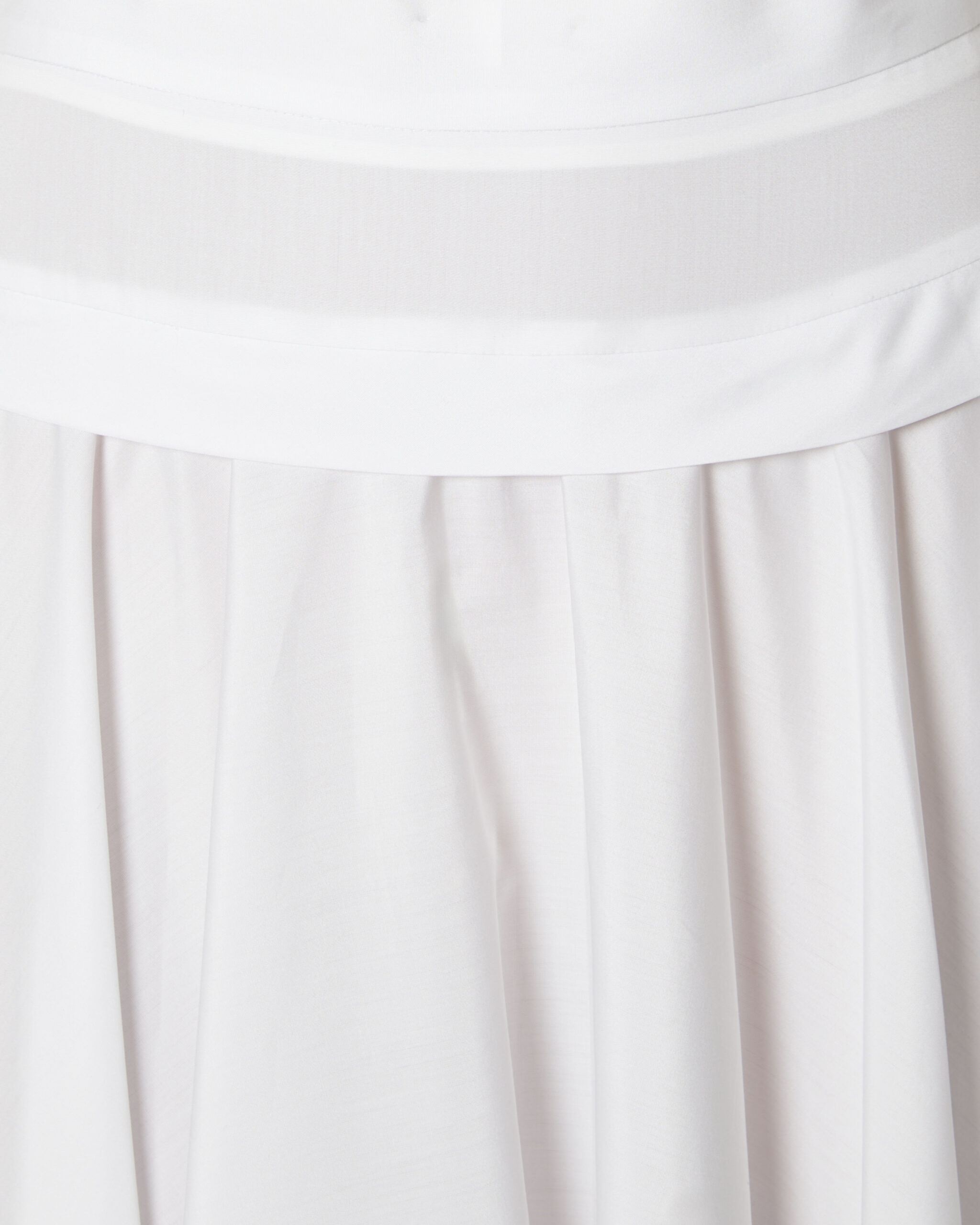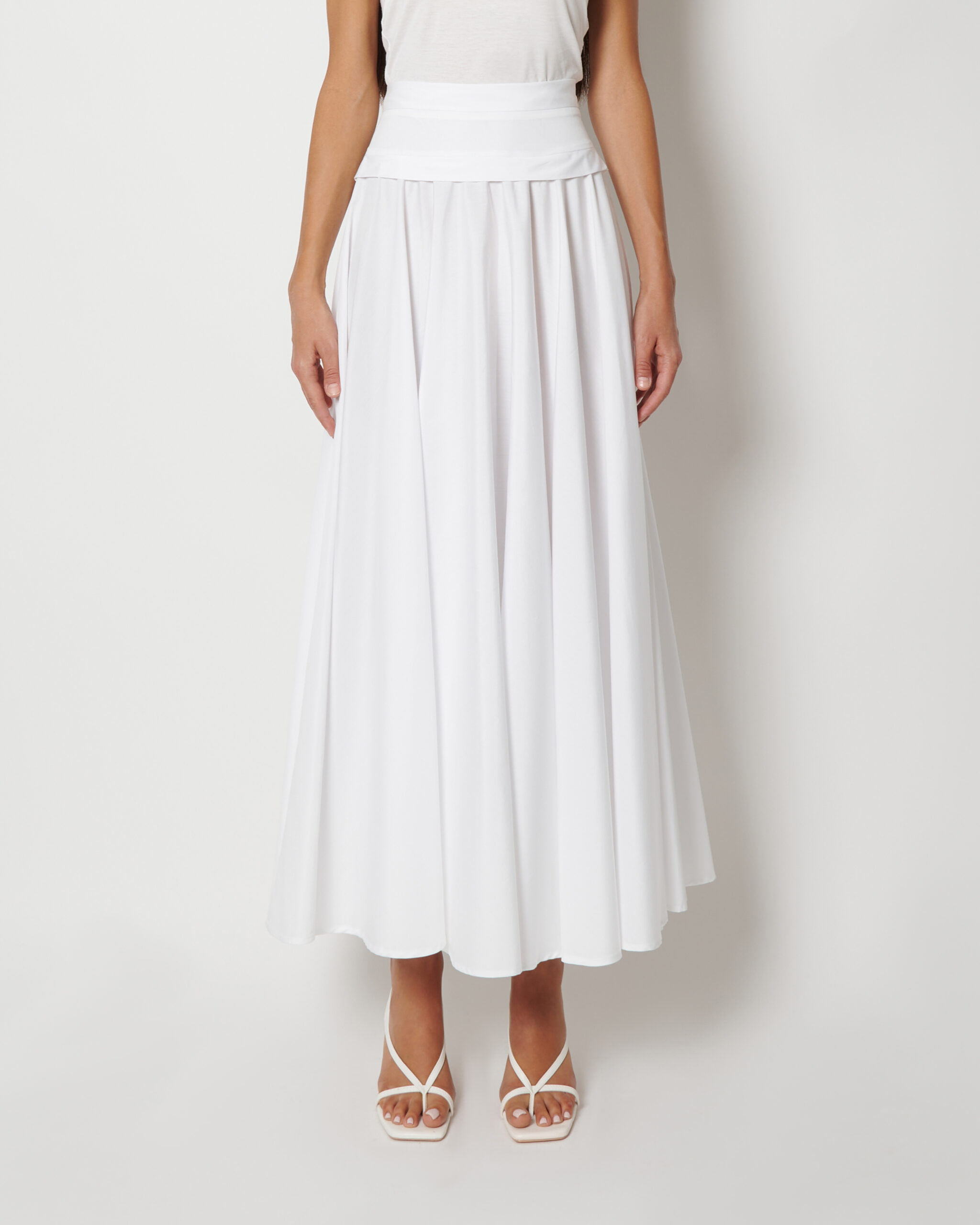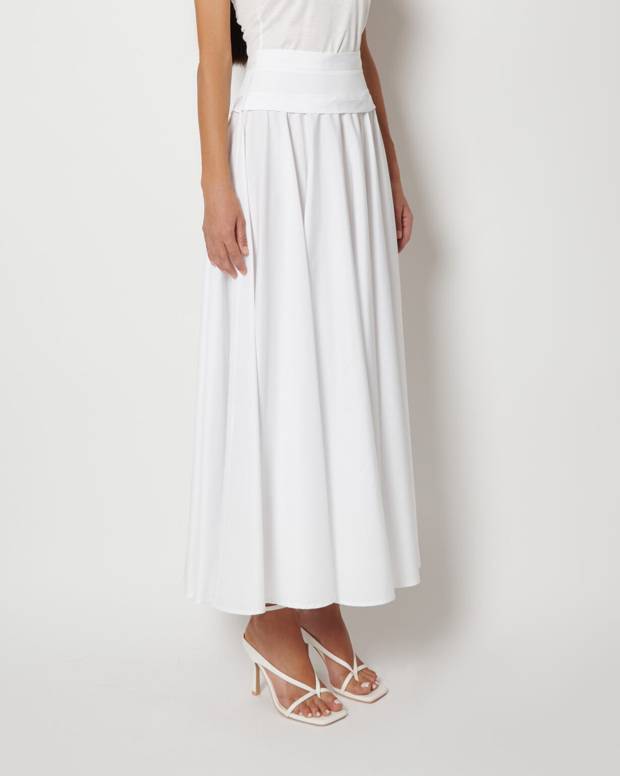 La forma si apre in modo uniforme dalla vita, creando movimento naturale e una caduta precisa. Il cotone compatto mantiene la struttura, esaltando la pulizia del design.