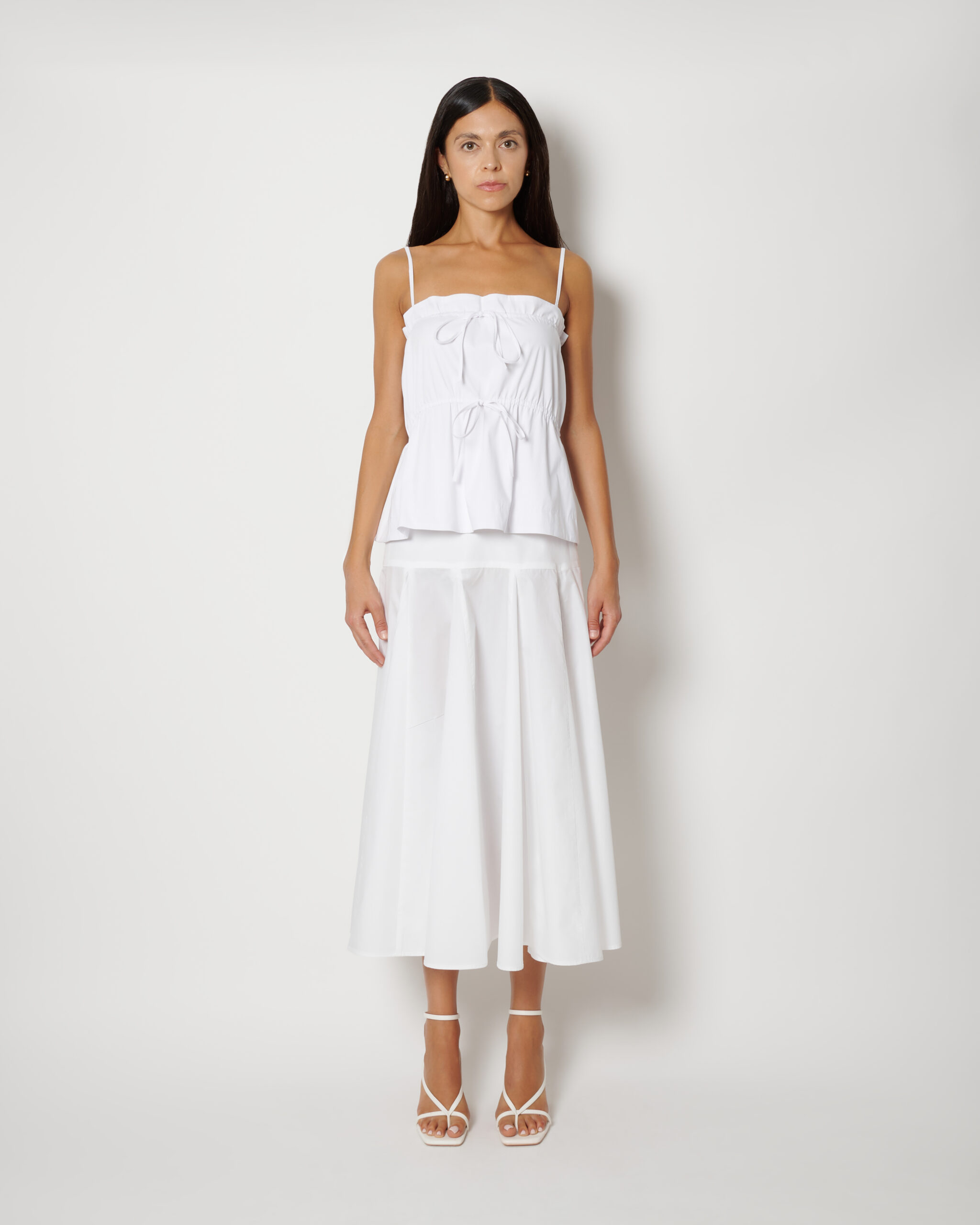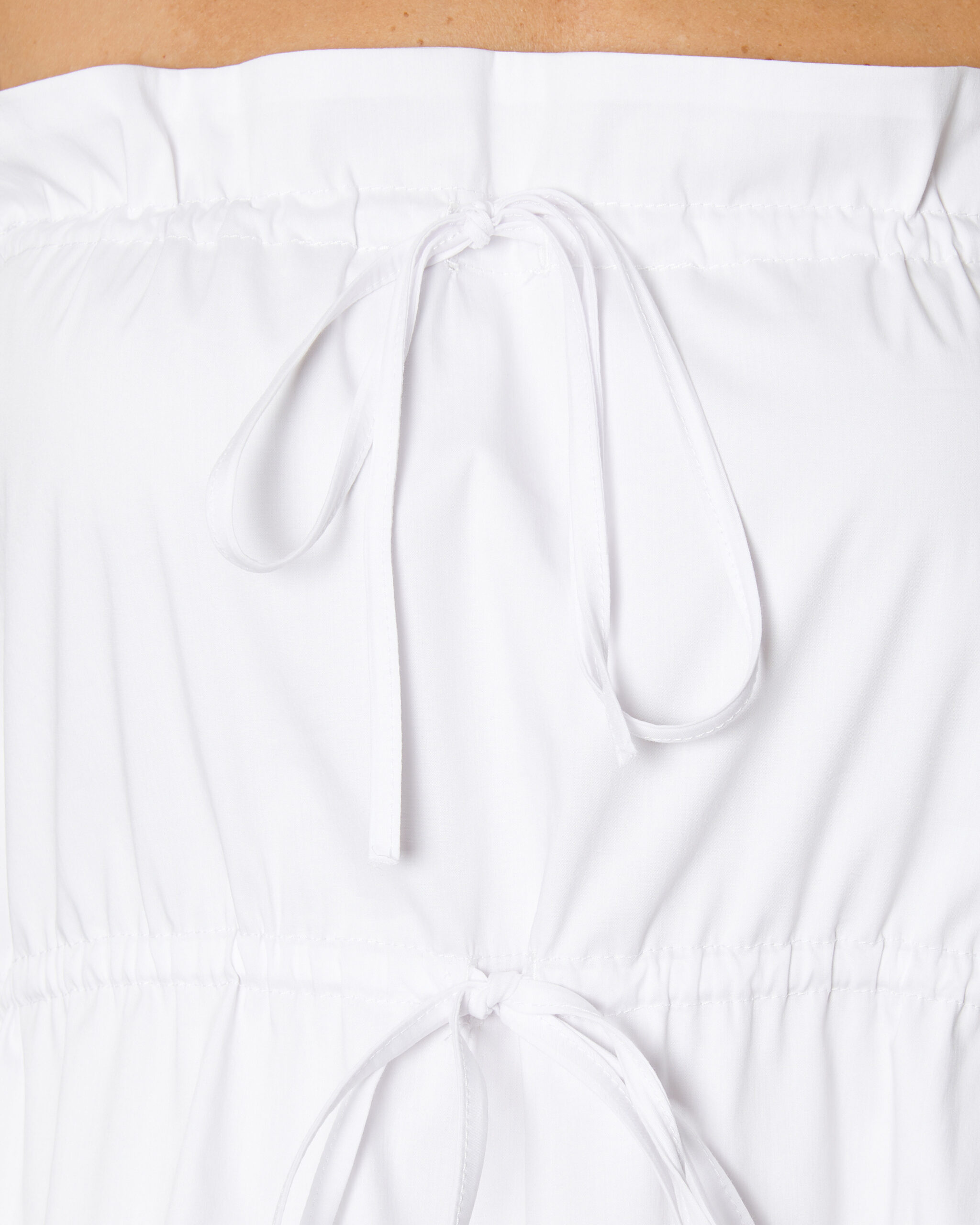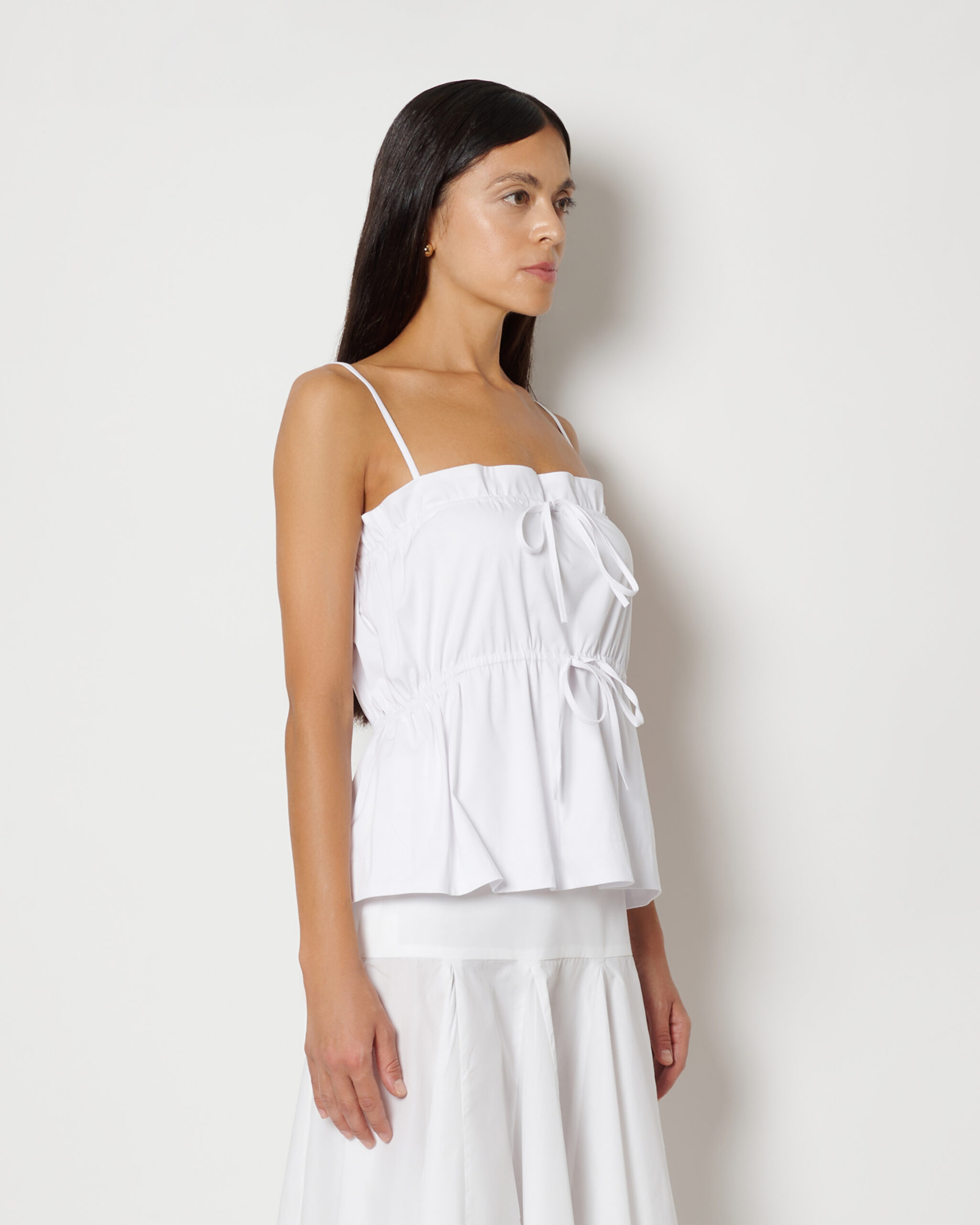 Questo top in cotone presenta una silhouette morbida con dettagli regolabili. Il modello è caratterizzato da spalline sottili, scollo arricciato con fiocco e coulisse in vita che permette di personalizzare la vestibilità.